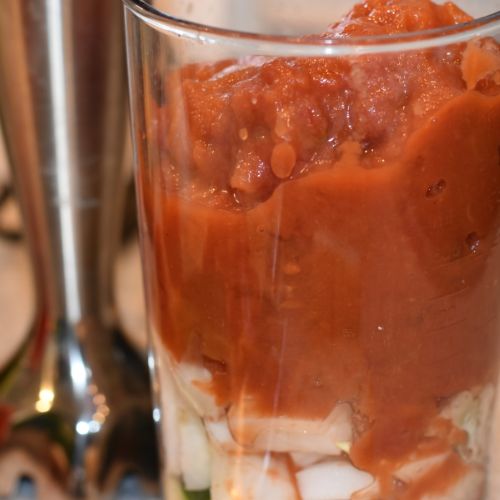 ④スープの濃さを調整するため、材料のパンをちぎって入れ、さらに撹拌し、好みのとろみになるように冷水を少しずつ加えながら調整する(サラっと飲みたい場合は冷水を多めに)