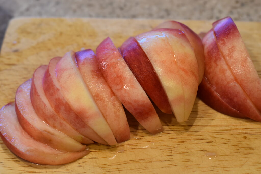 ① 桃をよく洗い、毛を落として5mmくらいの厚みに皮ごとスライスする