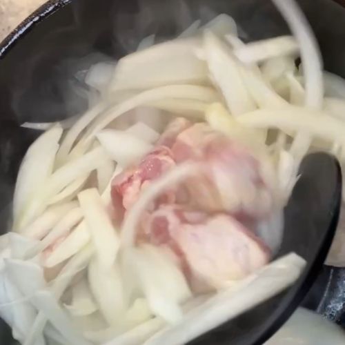 ④鍋でお肉を炒めて玉葱を入れ、煮込みます