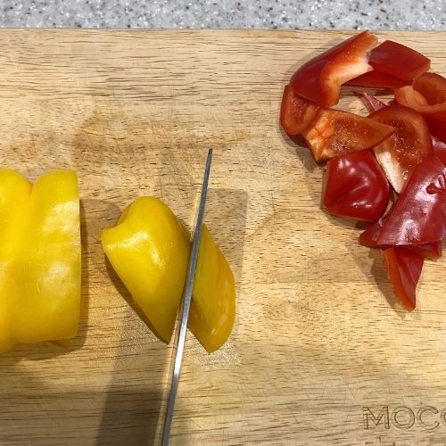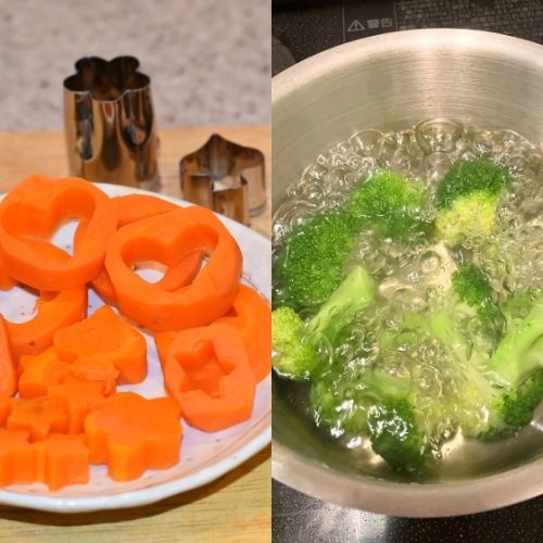 ⑤人参は0.7㎜位の厚さに切り、茹でてから型抜きをします。