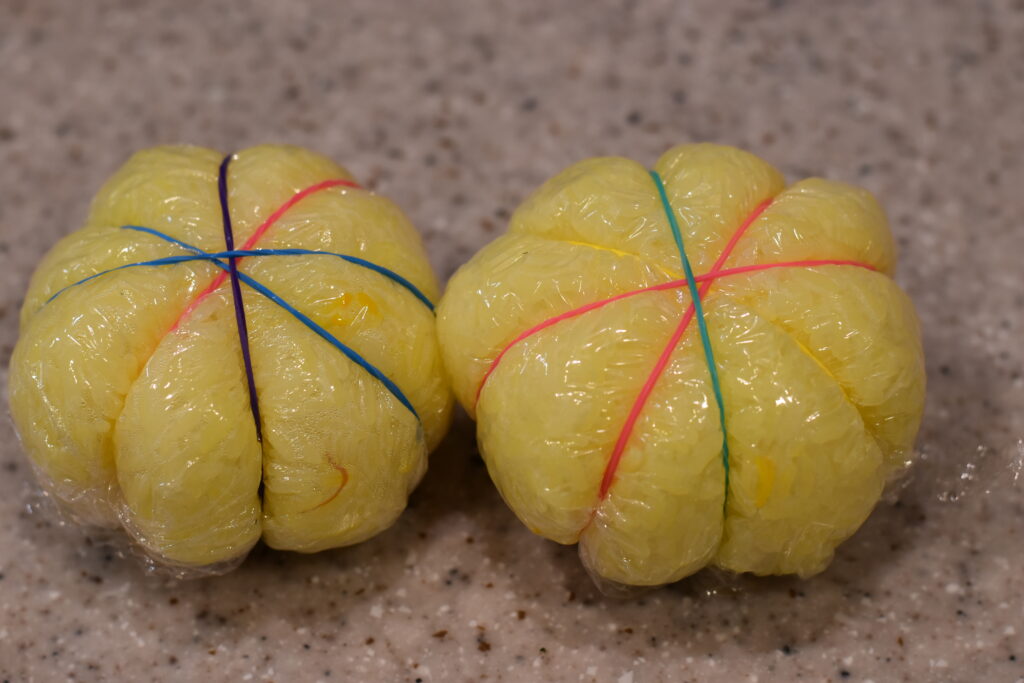 ②炊き上がったらラップに乗せてご飯を丸めます。輪ゴムを放射状に4本巻きつけ、少し置いて形がつくまで待ちます