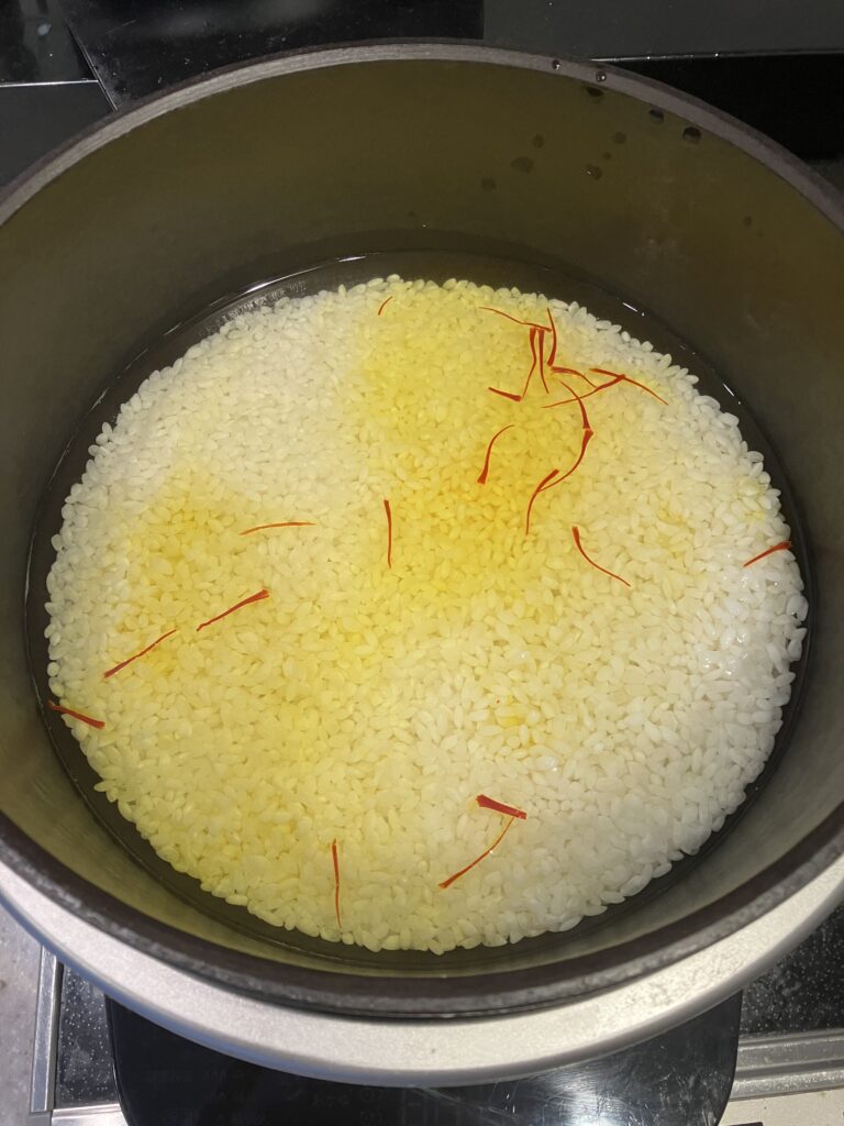 ⑦お肉が柔らかくなったらカレー粉を入れて、最後にはちみつを加え、お皿にカレー・サフランライス・野菜を飾り付けたら完成!