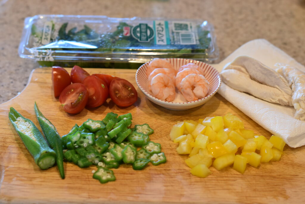 オクラは茹でて5㎜の輪切り、鶏ささみは茹でて細かくほぐし、海老も茹でてお好みに切る