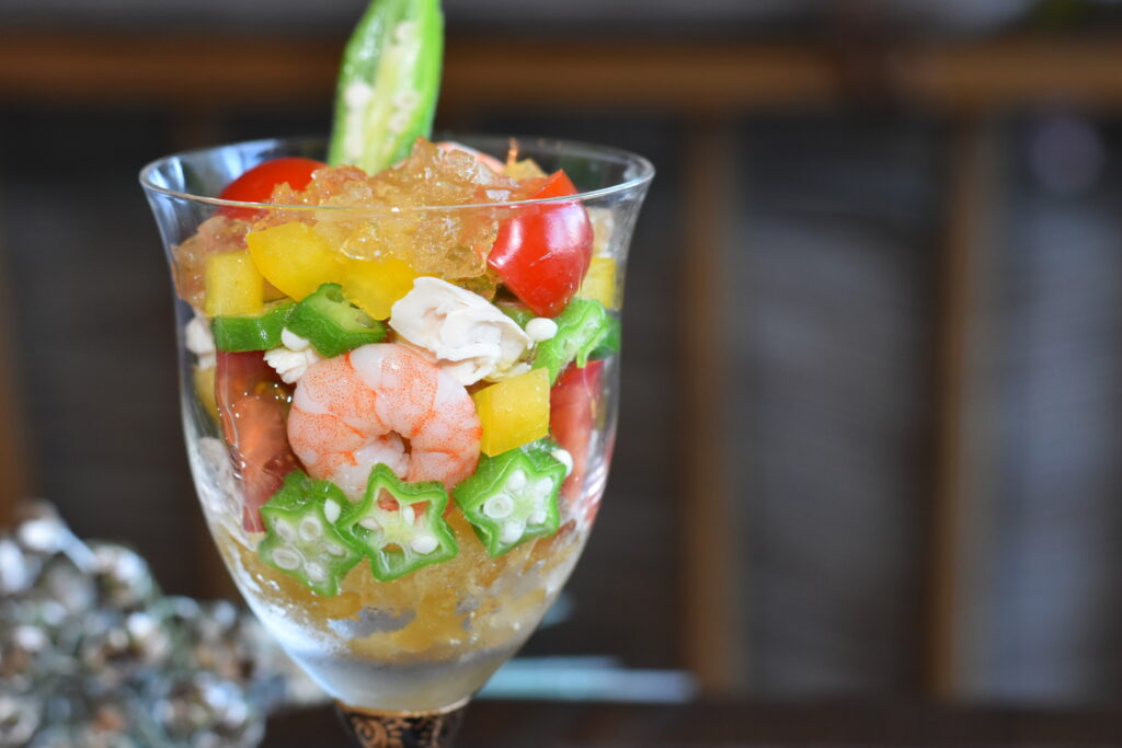 フォークで荒くほぐしたジュレをグラスに少量入れ、野菜・鶏肉・海老を盛り付けながらジュレを入れ込む