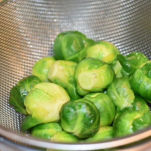 ①芽キャベツは軽く水で洗い、底面(芯の部分)に包丁で十字の切れ目を入れ、沸騰させたお湯に塩を加え、中~強火で2分間ゆでる。
