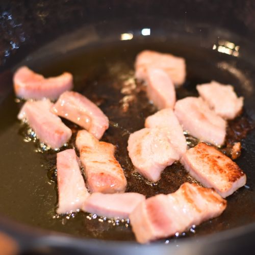 ③厚切りベーコンは1cm角に切り、中火で熱したフライパンで脂が出てくるまで炒める