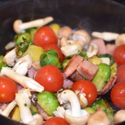 ④フライパンにオリーブオイルを加え、にんにく、芽キャベツも入れ焼き色がつくまで炒め、さらにしめじとミニトマトを加えて炒め火を止める