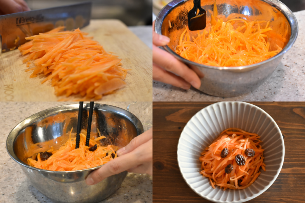 ① にんじん(とりんご)は皮をむいて千切りにして、ボウルに入れる。