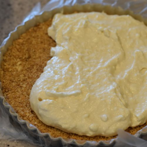 ①ビスケットをポリ袋に入れて細かく砕き、溶かしバターと混ぜ合わせ、タルト型の底に敷き詰めて冷蔵庫で冷やす
