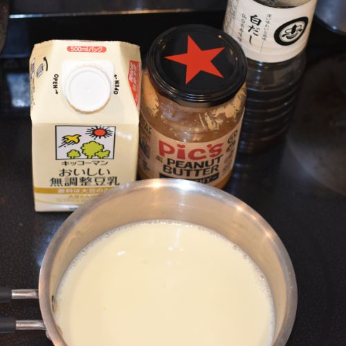②混ぜながらピーナッツバターが溶けたら火からおろし、冷たく冷やした豆乳を入れて混ぜ合わせる。白だしで味の濃さを調整する。(スープは盛りつけるまで冷蔵庫で冷やしておく)