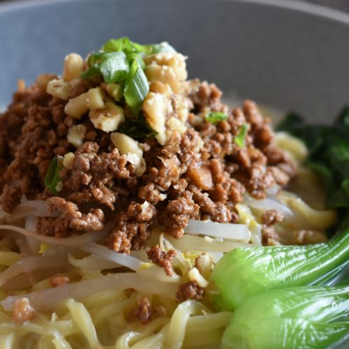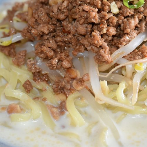 ⑤麺を茹でて水でしめたら器にもり、3のスープを注いで4のもやし、チンゲン菜、5の肉みそをのせる